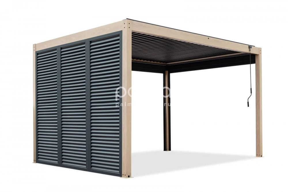 Алюминиевые верхние жалюзи с регулировкой угла наклона управляются с помощью ручной рукоятки, позволяя без усилий контролировать уровень освещенности и тени. Линейный, минималистичный профиль перголы гармонично вписывается в современные архитектурные решения, подчеркивая стиль любого outdoor-пространства.