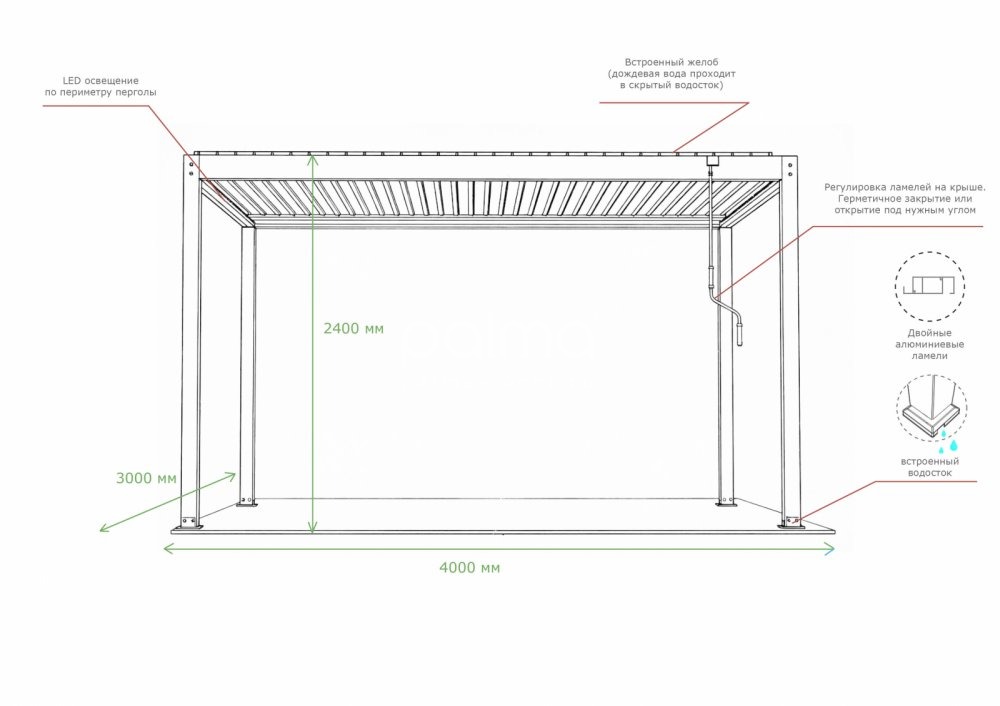 Встроенная разноцветная LED-подсветка создает уютную атмосферу в вечернее время, превращая террасу, патио или зону отдыха в многофункциональное пространство для любого времени суток. Дополнительные опции - раздвижные стеклянные панели, боковые шторы, жалюзи и экраны - обеспечивают защиту от ветра, дождя и посторонних взглядов, гарантируя комфорт и приватность в любую погоду.